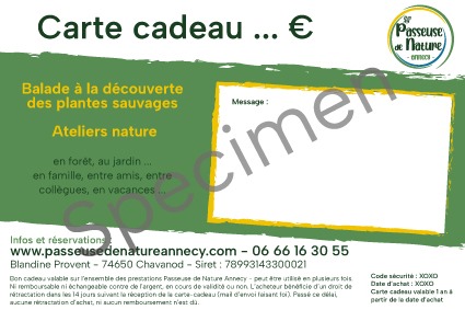 Cette carte cadeau est valable un an à partir de la date d’achat sur l’ensemble des prestations Passeuse de Nature Annecy et peut être utilisée en plusieurs fois.
